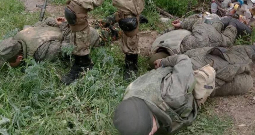 Усіх рашистів взяли в полон під Миколаєвом. На фото російські загарбники лежать на землі зі зв’язаними руками.