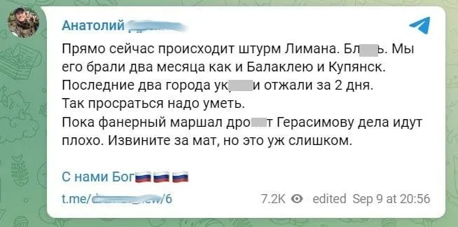 Як приклад, він опублікував скріншот одного з російських загарбників, яких скиглить через деокупацію українських міст у Харківській області.