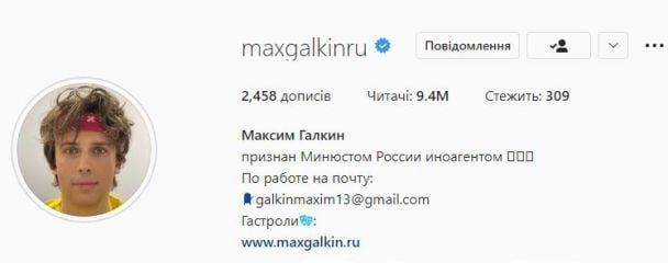 Так, у шапці профілю своєї сторінки в Instagram Галкін першим реченням гордо дописав: «визнаний Мін’юстом Росії іноагентом».
