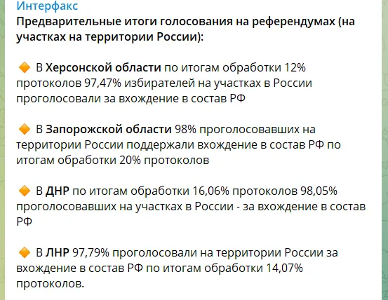 Згідно з намальованими Кремлем цифрами, понад 97% тих, хто нібито проголосував на території Росії, висловилися за «приєднання» до РФ.