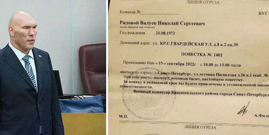 Колишній чемпіон світу в надважкій вазі Микола Валуєв отримав повістку і мав з’явитися до військкомату. При цьому документ не стосується часткової мобілізації, його депутату Державної думи вручили ще 15 вересня, що парламентар проігнорував.