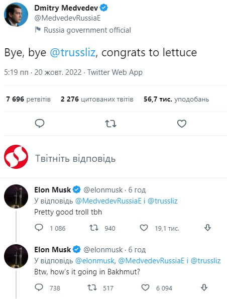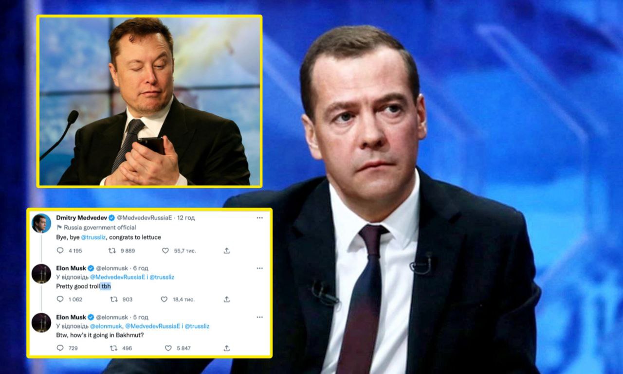 Ілон Маск потролив заступника голови Ради безпеки рф Дмитра Медведєва, який уїдливо відреагував на швидкоплинне прем’єрство Ліз Трасс у Британії. Остання займає чітко виражену антиросійську позицію на тлі агресії рф проти України.