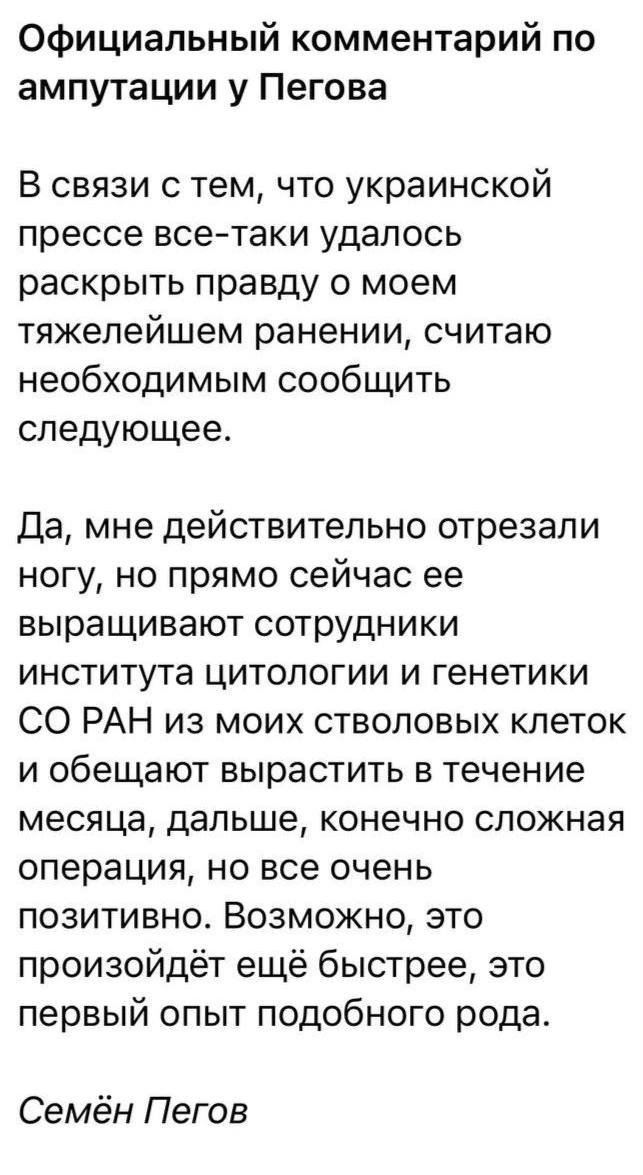 Можна лише «щиро поспівчувати» безногому журналісту. Кремлю він уже навряд такий потрібен – виконувати бойові завдання та їздити на війну Пєгов не зможе. Скоріш за все, у Кремлі для нього навіть не знайдеться роботи – хіба якісь нікчемні страхові Сємьону виплатять, а за ліпшого сценарію розвитку подій, дадуть «бєлую ладу».