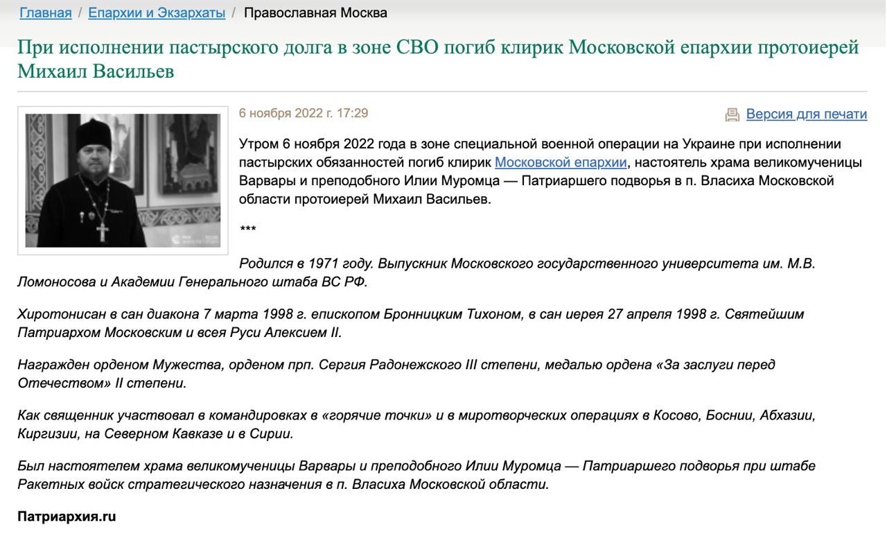 Як повідомляють на сайті РПЦ, протоієрей Михайло Васильєв загинув уранці 6 листопада «в зоні спеціальної військової операції в Україні під час виконання пастирських обов’язків».