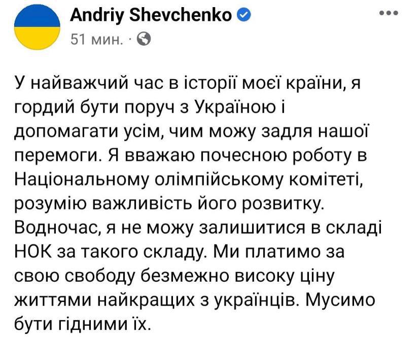 «Я вважаю почесною роботу в Національному олімпійському комітеті, розумію важливість його розвитку. Водночас я не можу залишитися в НОК за такого складу. Ми платимо за свою свободу безмежно високу ціну життями найкращих з українців. Мусимо бути гідними їх», — написав Шевченко.