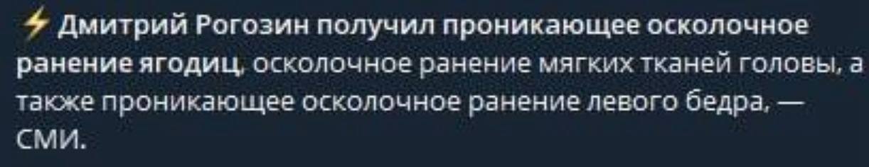«На околиці Донецька обстріляли готель, в якому в останні проживала група військових радників на чолі з Дмитром Рогозіним. Дмитро Олегович (Рогозін, — ред.) отримав поранення в спину. Він госпіталізований. Загрози життя немає», — сказав агентству співрозмовник.