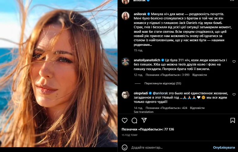 В соцмережі Інстаграм 44-річна артистка розповіла про свого рідного брата, який живе в Києві і ховається в підвалах, поки російські бомби знищують українську столицю. Зрадниця зателефонувала родичу і під час розмови почула звуки вибухів. Лорак поскаржилась, що цей момент зіпсував їй Новий рік.