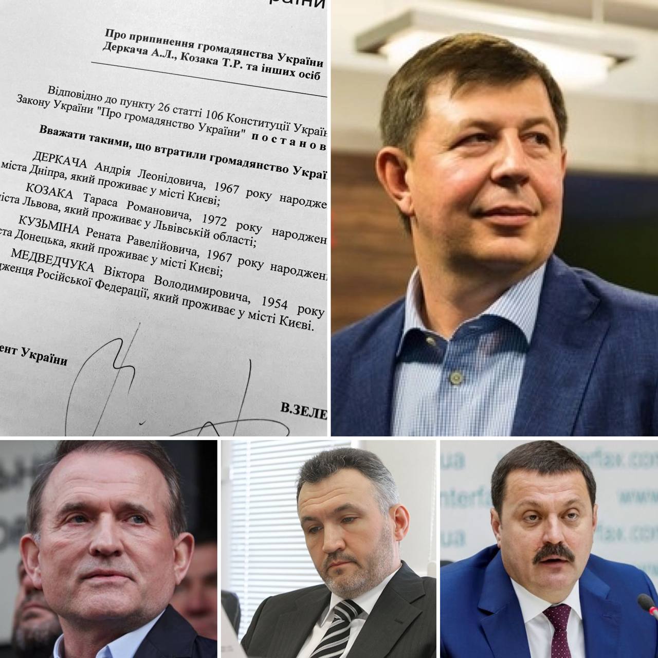 «На підставі матеріалів, які були підготовлені Службою безпеки України та Державною міграційною службою України, та відповідно до Конституції нашої держави я ухвалив рішення про припинення громадянства чотирьох осіб: Деркача Андрія Леонідовича, Козака Тараса Романовича, Кузьміна Рената Равелійовича і Медведчука Віктора Володимировича», – сказав він у відеозверненні у вівторок.