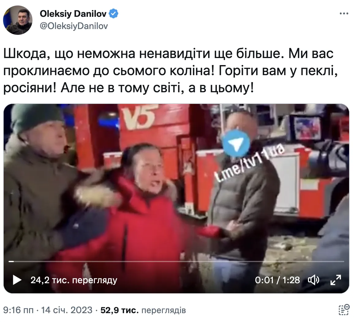 Секретар Ради національної безпеки та оборони України відреагував на ракетний удар РФ по багатоповерхівці у Дніпрі. Він пошкодував, що українці не можуть ненавидіти окупантів ще більше, ніж вони це вже роблять всі місяці повномасшатбної війни.