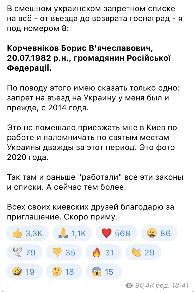 «З приводу цього маю сказати тільки одне: заборона на в’їзд в Україну в мене була і раніше, з 2014 року. Це не завадило приїжджати мені до Києва по роботі та паломничати святими місцями України двічі за цей період», – написав росіянин, який роками вчився майстерно брехати мільйонам людей.