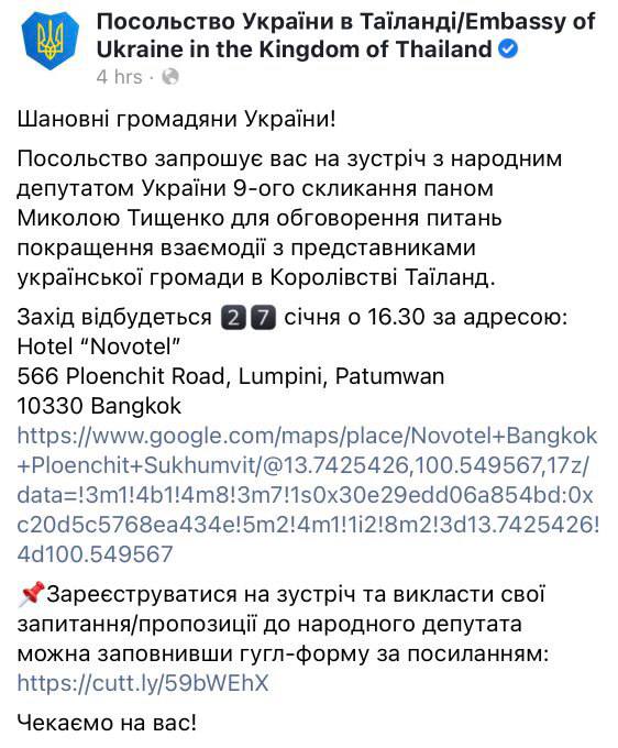 «Посольство запрошує на зустріч із народним депутатом України 9-го скликання Миколою Тищенком для обговорення питань покращення взаємодії з представниками української громади у Королівстві Таїланд», – йдеться у повідомленні.